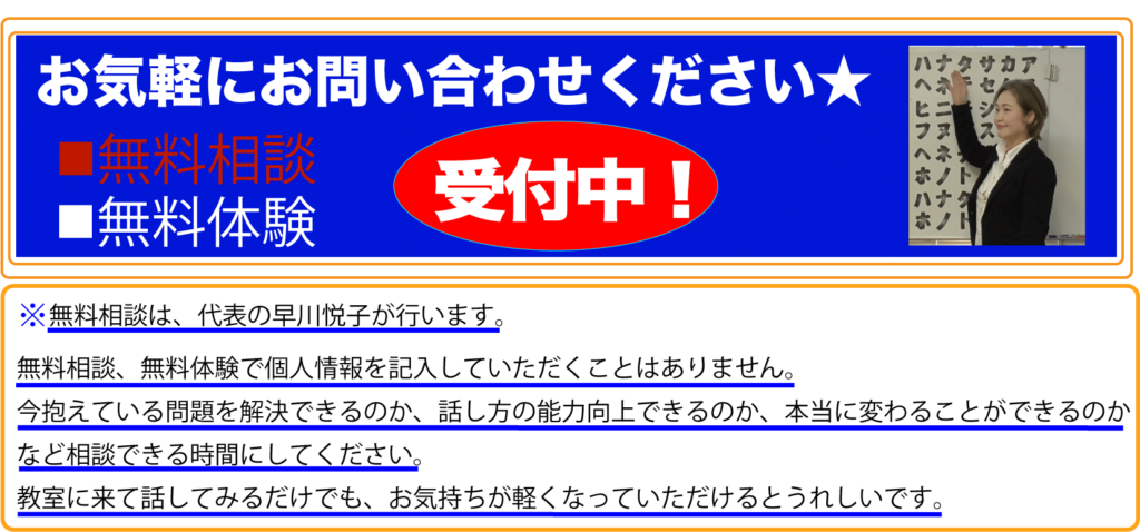 自分を変える「話し方」1日セミナーは無料体験ができません。直接参加申し込みもできますが、お時間がとれましたらぜひ、参加の前に無料相談を受けてみてください(30分位です)