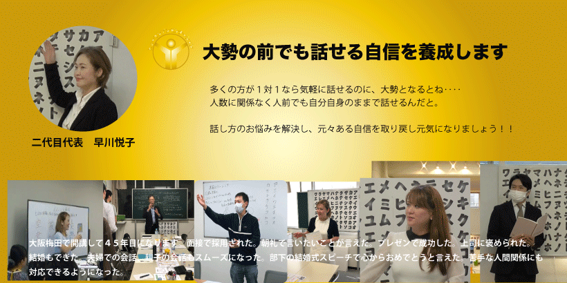 日本話し方スクールでは、一人ひとりの自信を養成するために、型にこだわらずに自由に自分らしく話していくことで本当という感じで話せるようになります。あなたが話しているという実感が人に伝われば、何よりもあなたが楽になります。